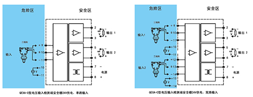 QEXA-C系列电压输入检测端安全栅将来自危险区的电压信号,经过隔离、干扰抑制等处理后转换成对应的电压、电流、通讯或开关量信号隔离传送到安全区的控制系统或其它仪表。输出可以为有源或无源信号。该产品需要独立供电,输入、输出、电源三隔离。