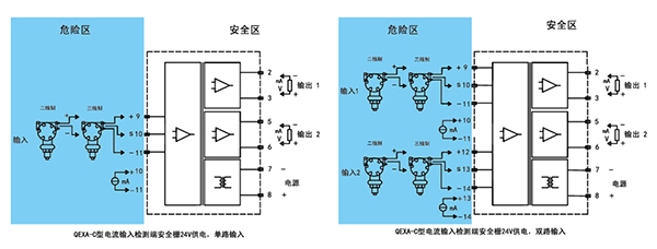 QEXA-C系列电流输入检测端安全栅给危险区的变送器提供隔离的直流电源,将变送器产生的电流信号(或电流源信号),经过隔离、干扰抑制等处理后,转换成电压、电流、通讯或开关量信号从危险区隔离传送到安全区的控制系统或其它仪表。输出可以为有源或无源信号。该产品需要独立供电,输入、输出、电源三隔离。