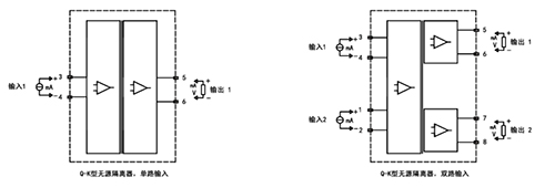 Q-K系列无源隔离器无需外供电源,从输入信号上获取少许能量,实现信号隔离传输。可以与各种工业传感器、现场仪表配合,取回参数信号,隔离变送传输,满足用户本地监视远程数据的需求。